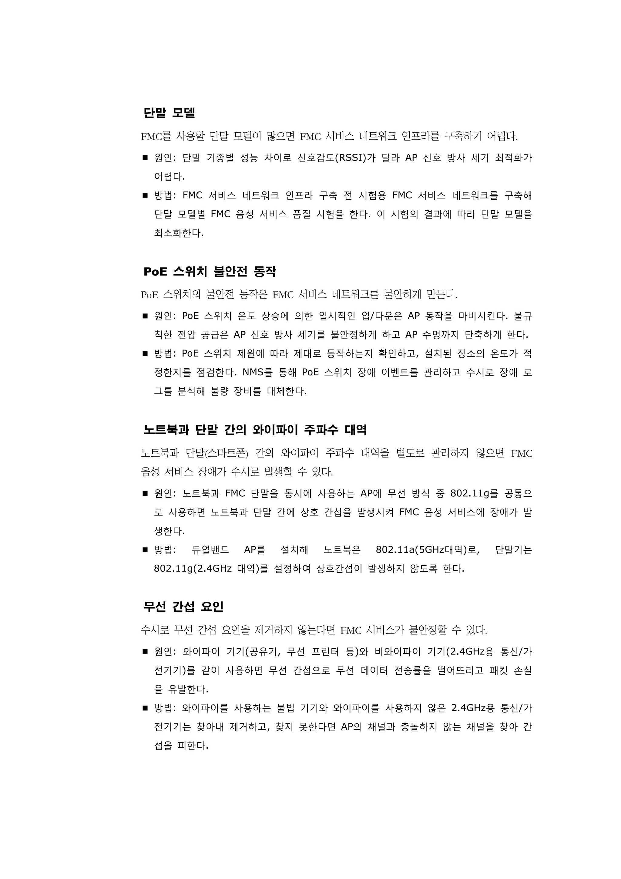 요소를 갖고 있다는 점과 무선 환경을 안정적으로 유지하기 위해서는 수시로 무선간섭