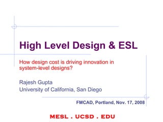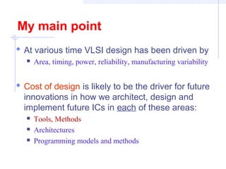 Rajesh Gupta argues that design cost is increasingly driving innovation in system-level integrated circuit designs. Future innovations will focus on tools, methods, architectures, and programming models to lower design costs. Verification techniques that improve designer productivity, such as refinement checking and explicit stateless model checking, will be important to address rising complexity. The solution space includes both improving EDA tools and developing new architectures.