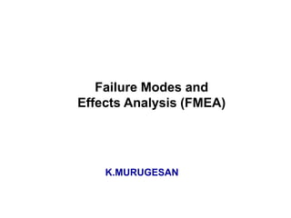 Failure Modes and Effects Analysis (FMEA) is a systematic tool used to identify potential failures, their causes, and effects. It helps prioritize issues based on a Risk Priority Number calculated from severity, occurrence, and detection ratings. FMEA was first used in the aerospace industry and has since been applied to automotive and other sectors. The analysis involves identifying failure modes, causes, and effects, then taking actions to reduce risks.