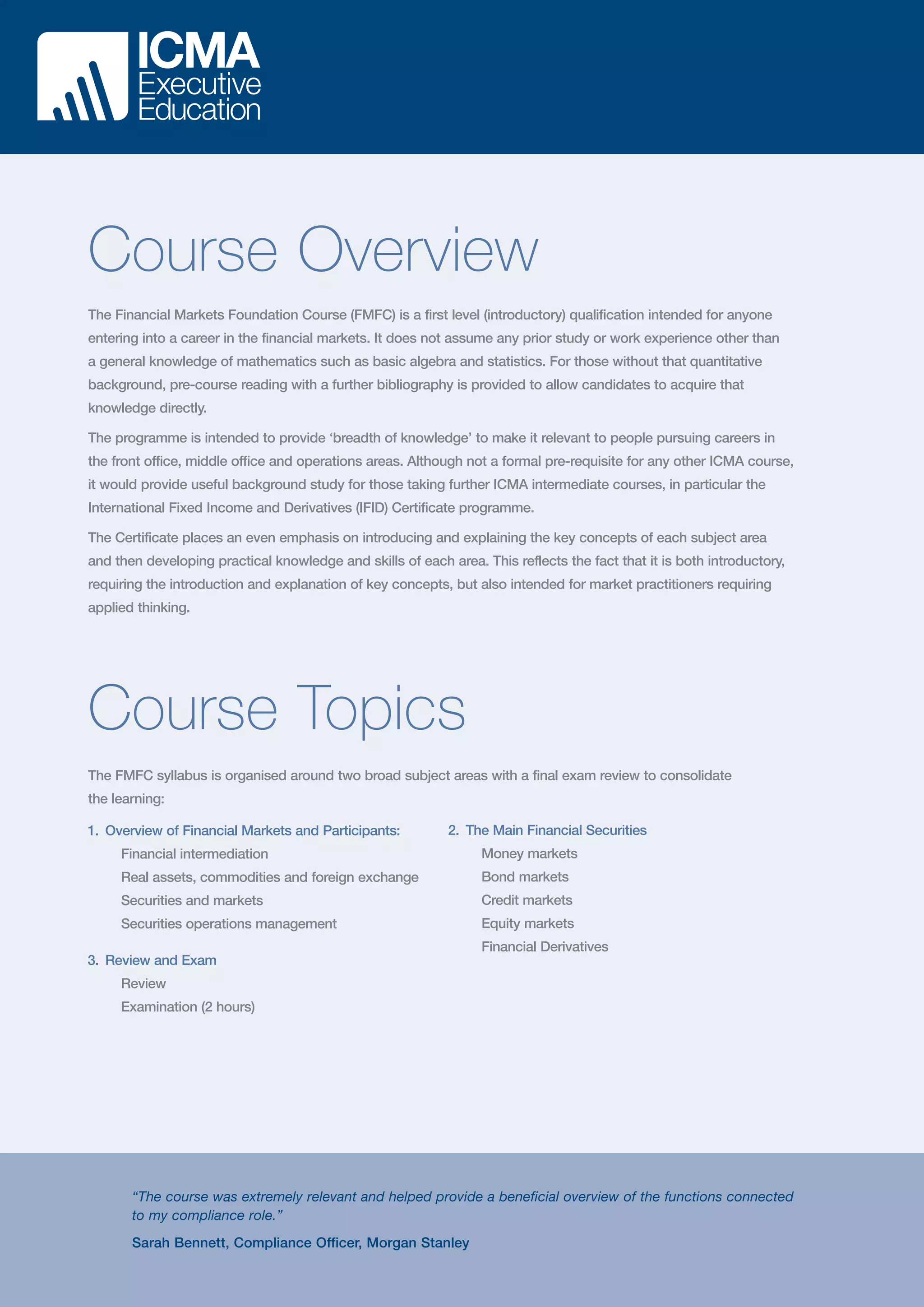 The Financial Markets Foundation Course (FMFC) is an introductory qualification intended for anyone entering a career in financial markets. Over the course of two broad subject areas and a final exam review, the FMFC provides an overview of key concepts and participants in financial markets, as well as the main asset classes and basic valuation models. The interactive course format includes case studies, exercises, and a final examination. The FMFC aims to give a breadth of knowledge relevant to front office, middle office, and operations roles across the sell-side and buy-side.