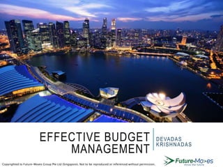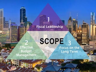 1) The document discusses effective budget management strategies used by the Singapore government, including focusing on long-term priorities, ensuring fiscal sustainability, and preparing for contingencies.