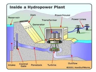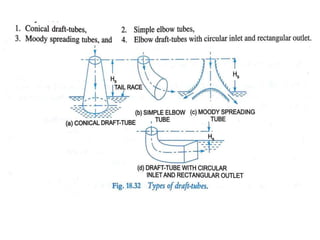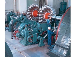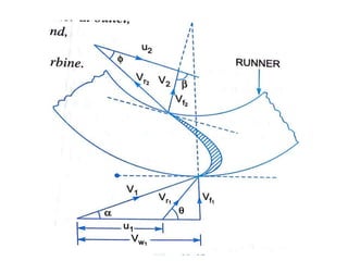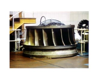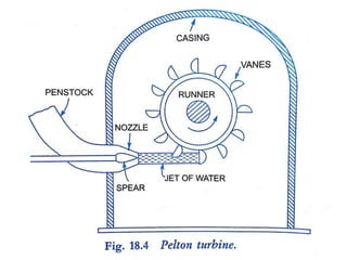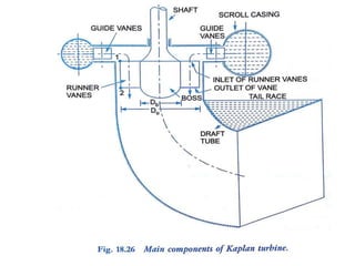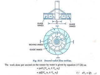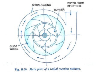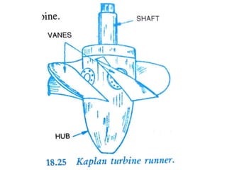 The document discusses different types of turbines. It describes the Francis turbine in detail. The Francis turbine is a mixed-flow reaction turbine used for medium heads and speeds. It has components like a penstock, scroll casing, speed ring, stay vanes, guide vanes, runner blades, and draft tube. Water enters the scroll casing and is directed by the guide vanes towards the radially inward curved runner blades to extract energy before exiting through the draft tube. The document also briefly describes the Kaplan turbine, an axial-flow reaction turbine suitable for low heads. Both the guide vanes and runner blades of the Kaplan turbine can be adjusted for high efficiency.