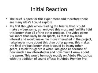 The document outlines initial plans for an experimental project, including focusing on a sports video game created in Adobe Photoshop and Premier Pro. The author's first thoughts were to make a sports video game since they enjoy and feel proficient in this genre, specifically focusing on football which is their main interest. A mood board was also created with images related to different aspects of football to inspire and influence the design of the final video game product.