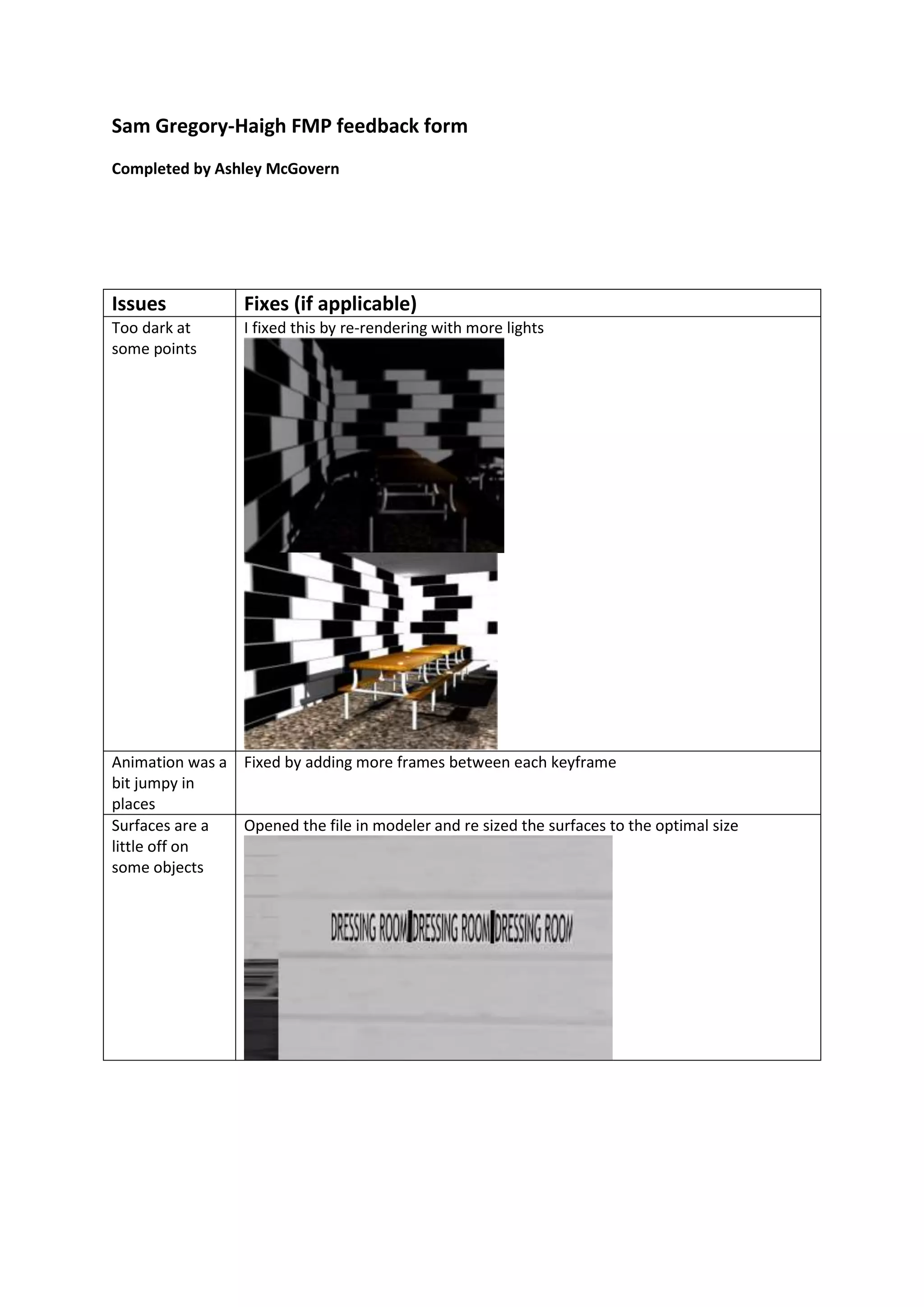 This document contains feedback from three reviewers - Ashley McGovern, Paul Coughlin, and Barbara Gregory - on a film project by Sam Gregory-Haigh. Ashley addressed issues with lighting, animation smoothness, and object surfaces. Paul agreed with fixing the animation but left the lighting. Barbara suggested adding a background color, making doors 3D, and including music.