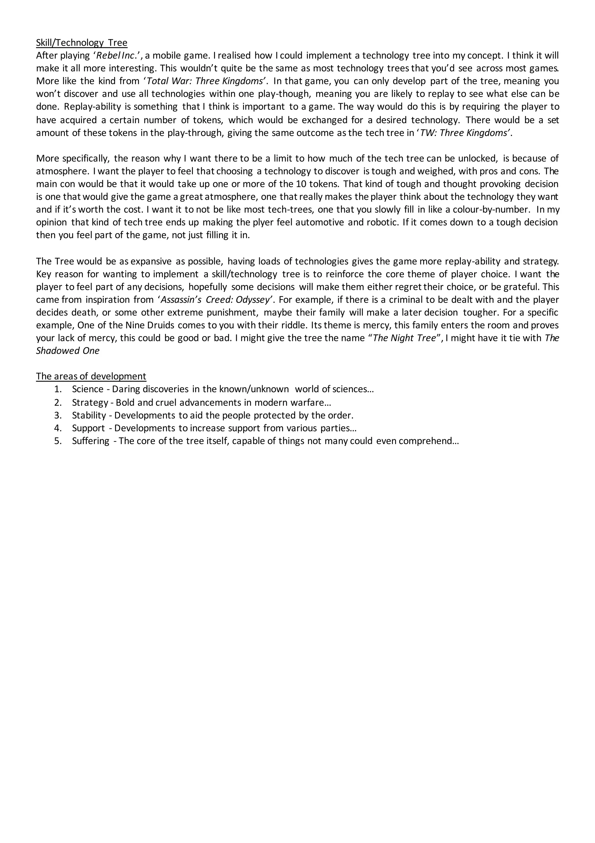 The document discusses implementing a skill/technology tree in a game concept. It would require the player to acquire a limited number of tokens to unlock parts of the expansive tree, similar to Total War: Three Kingdoms. This would force difficult choices in which technologies to pursue, reinforcing the theme of player choice and creating lasting consequences. Unlocking technologies could both help and hinder the player's progress, improving replayability and atmosphere by making decisions more impactful. The tree would be called the Night Tree and focus development in areas like science, strategy, stability, support, and suffering.