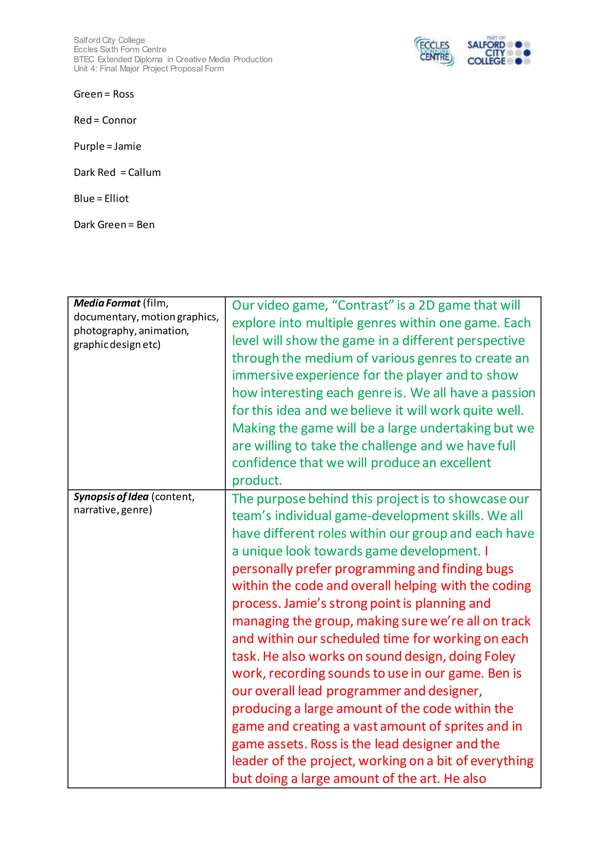 The document is a proposal form for a final major project creating a 2D video game called "Contrast" that will explore different genres within each level. A team of 6 students will work together on the project, each having different roles and skills related to game development, programming, art, sound design, and project management. They plan to use various software programs like Game Maker for design and coding, Reaper for sound editing, and Photoshop for additional sprite and cutscene artwork. The goal is to create an immersive game that appeals to both male and female teenage to young adult gamers by merging different gameplay styles, art, and music representative of different genres into one cohesive experience.