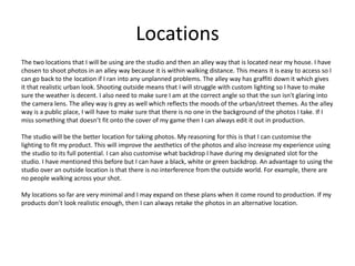 The document provides planning details for a project to create video game cover art. It discusses two potential photo shoot locations - an alleyway near the creator's house and a college studio. The alleyway offers an urban backdrop but lacks lighting control, while the studio allows custom lighting and backdrops. Financial plans estimate costs below £30 for props like bandannas, shirts, caps and a toy gun. Production timelines aim to complete half a cover per week over 6 weeks. Equipment like a Canon DSLR and tripod from the college will be used, along with Photoshop for editing. Props, costumes in black and white, and minimal copy text are discussed. Potential color schemes and fonts are considered for their visual
