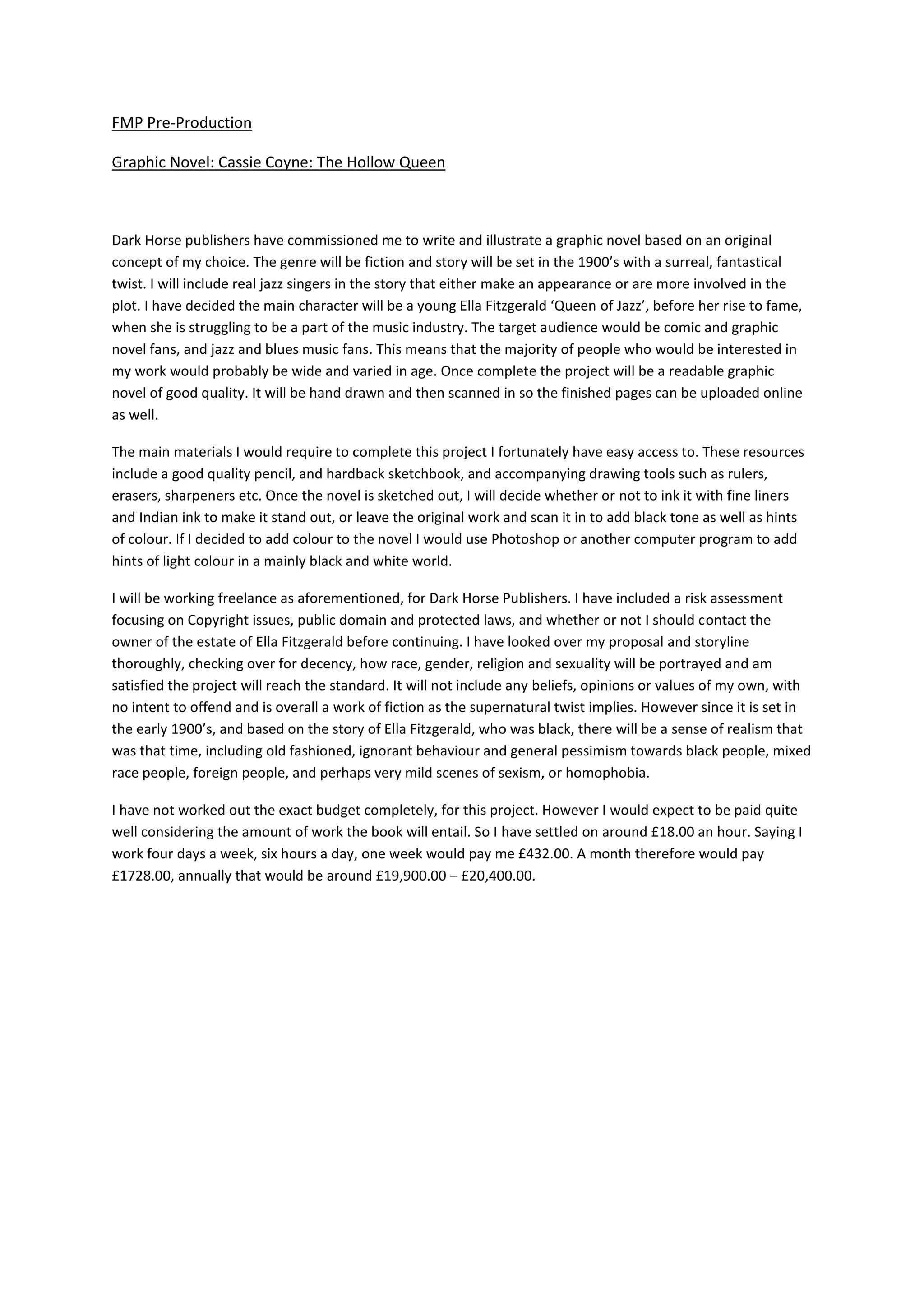 The document outlines a pre-production plan for a graphic novel called "Cassie Coyne: The Hollow Queen". The main character will be a young Ella Fitzgerald before her rise to fame, struggling in the early 1900s music industry. Research will include jazz, blues, and Ella Fitzgerald's life. The novel will be hand drawn and scanned, possibly with added color. Risks like copyright will be considered. The creator expects to earn around £20,000 annually working 4 days a week on the project. A production log and schedule are included to plan and track progress.