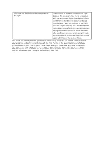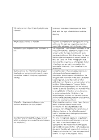 The student proposes an artistic short film called "Invincible" about the dangers of alcohol and excessive drinking, especially among teenagers and young adults. They want to address this important topic to raise awareness of how alcohol can be dangerous and encourage responsible drinking. Some influences on the idea include celebrities like Robin Williams who struggled with alcoholism. The film will have a dark, serious tone to appropriately portray the serious nature of substance abuse issues as the main character's condition worsens. The goal is for viewers to realize how important it is to understand this topic and to have an emotional response to raise awareness of the damage caused by irresponsible drinking.
