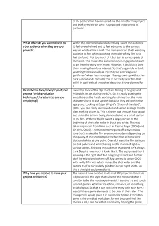 This document summarizes a student's filmmaking and promotion project (FMP) for school. The student plans to create a short film and accompanying promotional materials. They intend for the film to have a dark, 1980s working class tone inspired by directors like Quentin Tarantino and Edgar Wright. In the trailer, they want to confuse audiences and shift between serious and comedic tones. They have researched films with monochrome and tonal shifts like Sin City. Posters for The Exorcist and Halloween have influenced the student's ideas around using subtle lighting and symbolism to set a creepy tone without being overt.