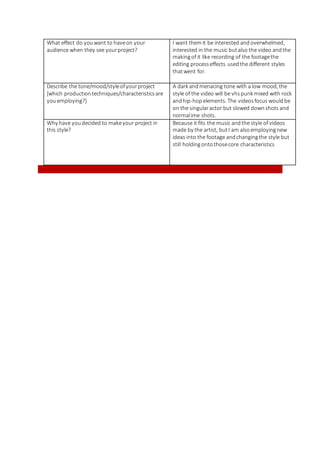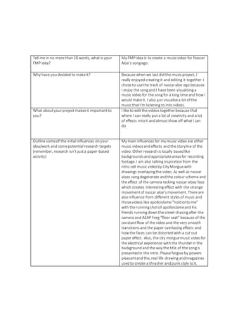 The student proposes creating a music video for the song "ego" by Nascar Aloe. They chose this project because they enjoyed creating a previous music video and have long visualized making a video for this particular song. The student finds the editing process creative and enjoys experimenting with different effects. Main influences for the video include other music videos, effects, and the song's storyline. Research will involve locating suitable background locations and taking inspiration from videos like City Morgue's "nitro cell" and Nascar Aloe's "degenerate." The goal is to interest audiences in both the music and video production process through techniques like slowed shots, normal speed shots, and a dark, low-mood, punk/hip-hop style