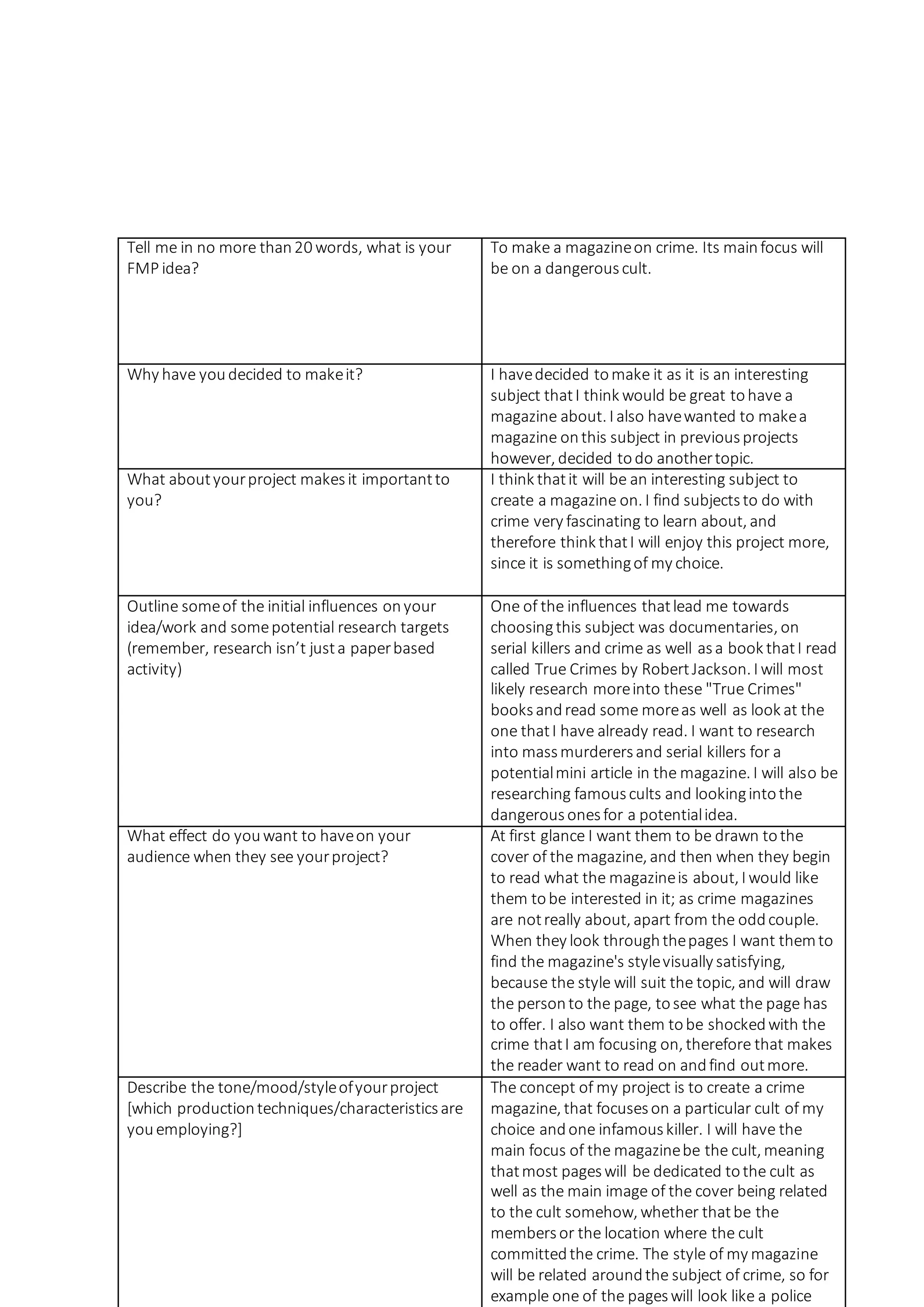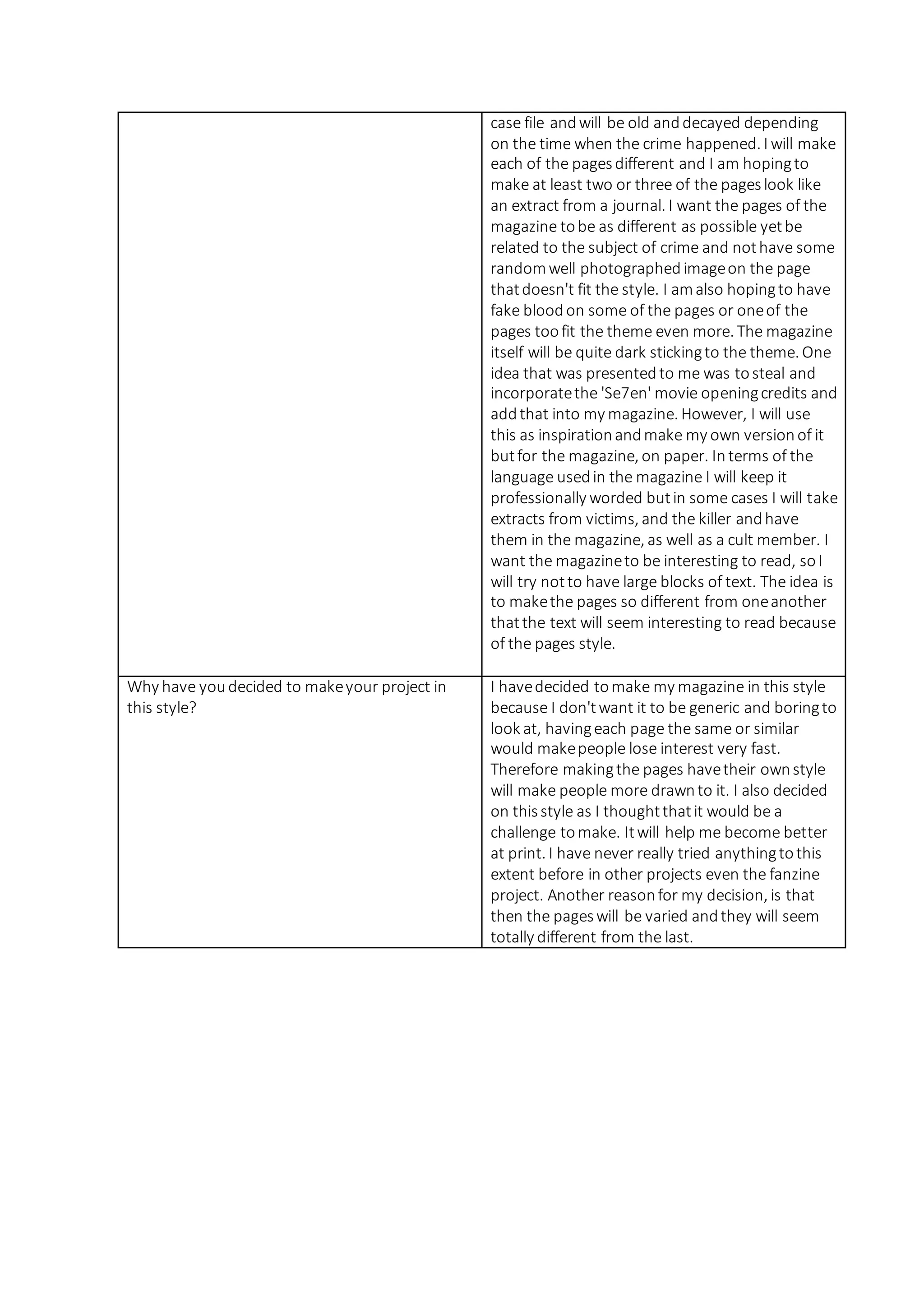 The student proposes creating a magazine focused on a dangerous cult and infamous killer. They chose this topic as they find crime fascinating and want to research cults and serial killers. The magazine will have varied page styles, including fake blood, decayed documents, and journal extracts to create different moods and engage readers. The goal is to shock readers and make them want to learn more about the cult through the visually interesting magazine.