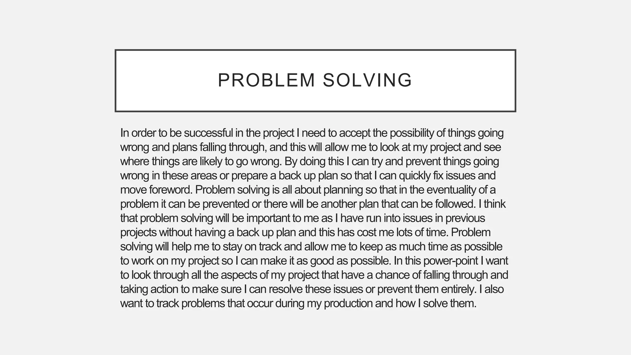 This document outlines Adam Lepard's plans for problem solving and addressing potential issues throughout his film production project. He discusses both practical/technical problems like equipment, location, weather, and props as well as theoretical problems such as crew dynamics, refreshments, finances, health and safety, job roles, and production time. For each potential problem area, Adam provides details on his planned solutions and backup plans to prevent or quickly fix any issues that may arise during production.