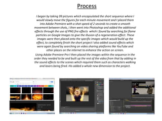Connor Wiffen created an experimental stop motion movie by taking 99 pictures of figures in slow movement over 1 minute intervals. The pictures were edited in Photoshop to add fire effects and compiled in Premiere Pro with a 2 second shot speed to create smooth movement. Sound effects were also added from online sources. For a DVD design experiment, Connor found a template and added a continuous city landscape wrapping around the front and back. Character images and explosions hinted at the film's action while following common DVD design elements like title, logos, and credits. The back included a barcode, ratings info, special features, screenshots and a plot synopsis. Connor plans to carry over editing techniques for effects and use similar programs and