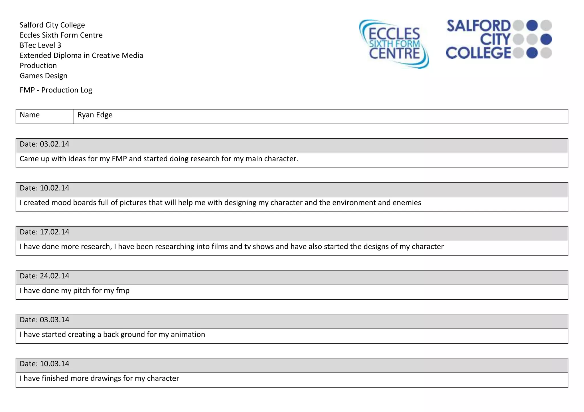 Ryan Edge is a student at Salford City College Eccles Sixth Form Centre pursuing a BTec Level 3 Extended Diploma in Creative Media Production in Games Design. Over the course of February and March 2014, Ryan worked on his Final Major Project, which involved researching and designing a main character, creating mood boards, illustrations, and drawings of the character and environment, developing a pitch, animating the character and an enemy, and ultimately completing an animation for his FMP.