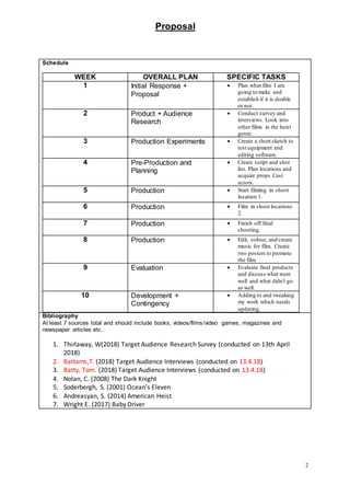 This proposal outlines a short film project called "Hacked" about a 16-year-old hacker named Alex who is recruited by a criminal organization to help with a bank robbery but later regrets his decision. The proposal discusses conducting research on heist films and security systems to make the plot believable. It includes a schedule spanning 10 weeks for writing the script, filming, editing, evaluating, and potentially updating the project. Research methods like surveys and interviews of the target 16-24 male audience are mentioned. Skills learned over the past year like camera work, editing, and audio will be applied to the project.