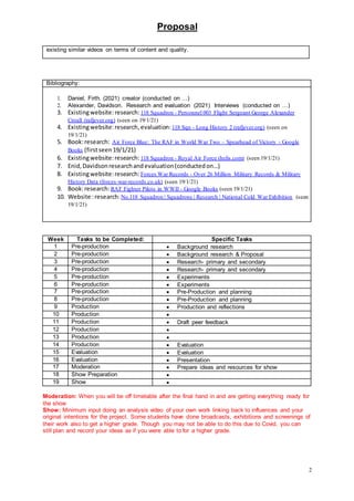 This document is a project proposal by Daniel Alexander Davidson Firth about creating a website and short video honoring his great uncle who was a RAF pilot in World War 2 and was lost in action. The project will include animated banners, interviews with family members, historical photos, and research on the plane model and squadron. Research sources will include family records and online archives. Progress will be evaluated daily during production and through peer review. The final project will be compared to similar WWII and squadron websites and videos.
