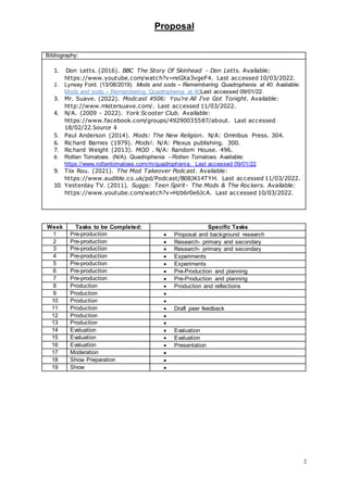 The student proposes creating a documentary on the mod subculture in the UK. They plan to research existing works, travel to Margate to understand mod history firsthand, and interview people about their experiences. The student will use skills learned in Photoshop and Premiere Pro to edit the documentary and create promotional materials. They will evaluate their work through self-reflection forms and a final evaluation focusing on research, video, and areas for future improvement.