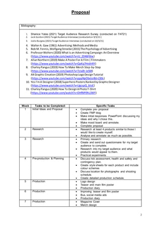 Shanice Yates proposes creating a marketing package for an original superhero film concept called "The Sorceress". She will design promotional posters, logos, merchandise, and other materials. To evaluate her work, Shanice will keep a production diary and get feedback from peers and family on her final products. Her previous marketing package project provided experience that will help with skills like designing in Photoshop. Research will include studying other superhero marketing campaigns and determining colors and styles that appeal to her target audience.