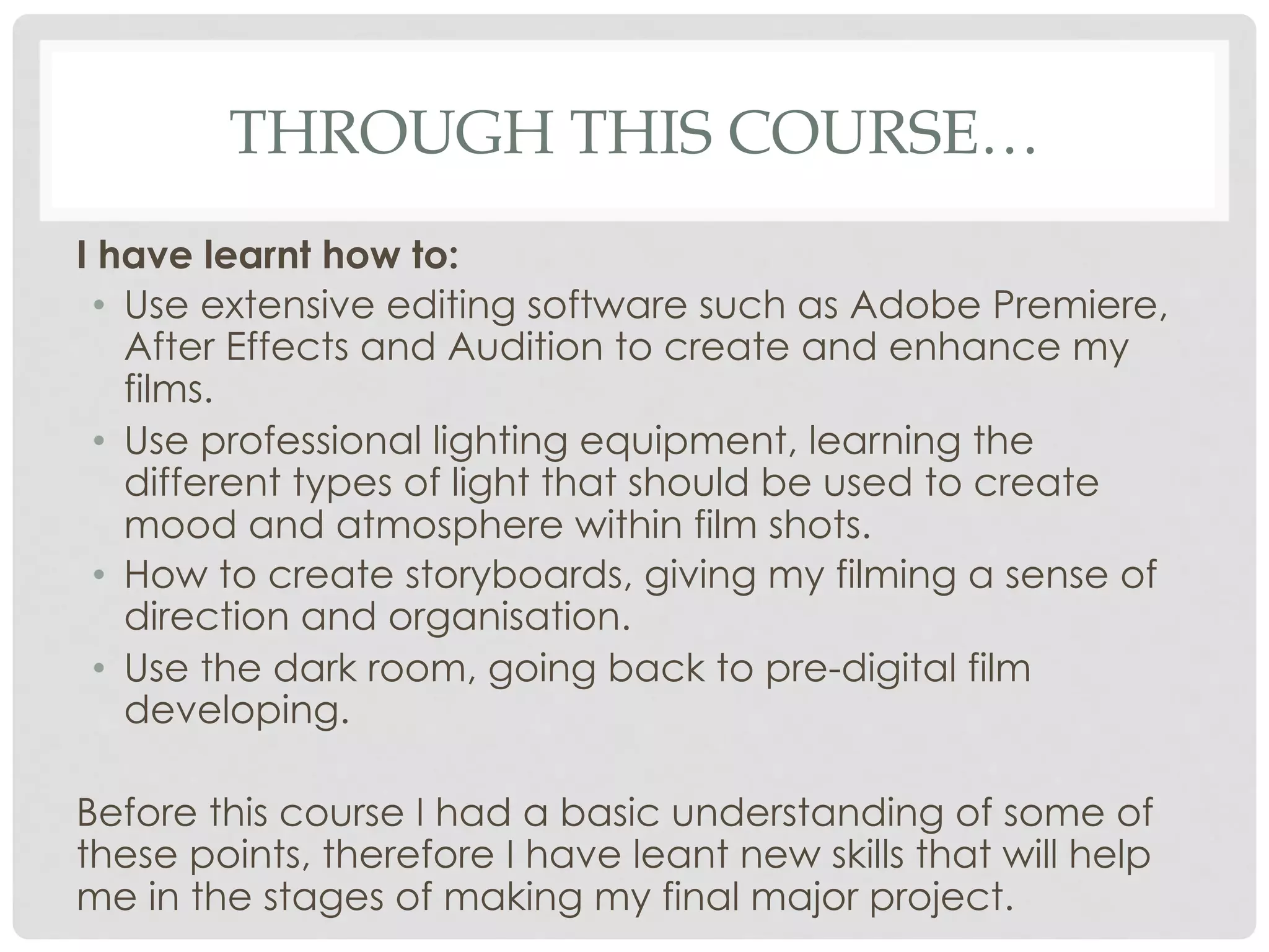 This document is a film project proposal from Sarah White. She outlines how she has learned skills like video editing, lighting, storyboarding, and film development through her course. For her final major project, she is considering ideas like a performance film, horror film, nature documentary, or video tour guide. She decides to focus on filming live performances. She will film street performers in London to create a montage showing different acts. She also plans to film flash mobs as part of her documentary-style film aiming to show street performance culture.