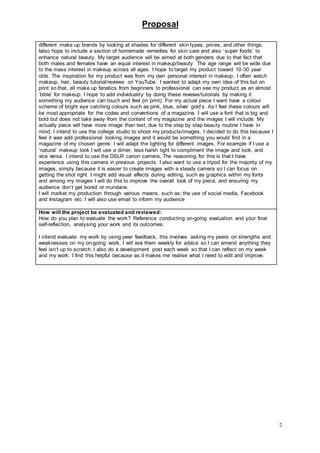 Charlotte Oliver proposes creating a magazine called "Masque Magazine" focused on photography and journalism. She outlines the skills developed throughout her studies that will help with the project, such as organization, communication, and using software like Adobe and Photoshop. The concept is for a print magazine with makeup tutorials, reviews, and articles aimed at ages 10-35 of all genders and backgrounds. Research methods are surveys and analyzing existing magazines. Evaluation will involve peer feedback and comparing to other products.