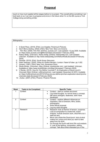 Lily Ajaib is proposing a short film project titled "Present" to be completed by Week 18. The concept is a thriller about a girl receiving a puzzle box that contains threatening messages. Lily will document the process through a production diary and evaluate the final project. Research will include studying techniques for building tension from the works of David Lynch and examining how other films use elements like sound, lighting, and composition to create atmosphere. Pre-production will involve planning, storyboarding, and securing locations and equipment. Principal photography and editing will occur between Weeks 8-11, with evaluation and a presentation in the final weeks.