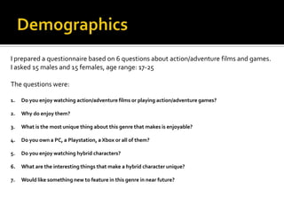 My project involves designing a hybrid human-reptile character for an action/adventure/sci-fi game or film. I conducted a questionnaire that found people enjoy these genres and hybrid characters. Specifically, they enjoy the excitement, unique features of hybrids, and would like to see something new. Examples like Spiderman and God of War, which include hybrids, have been very successful. This suggests my character could also find success in these popular genres.