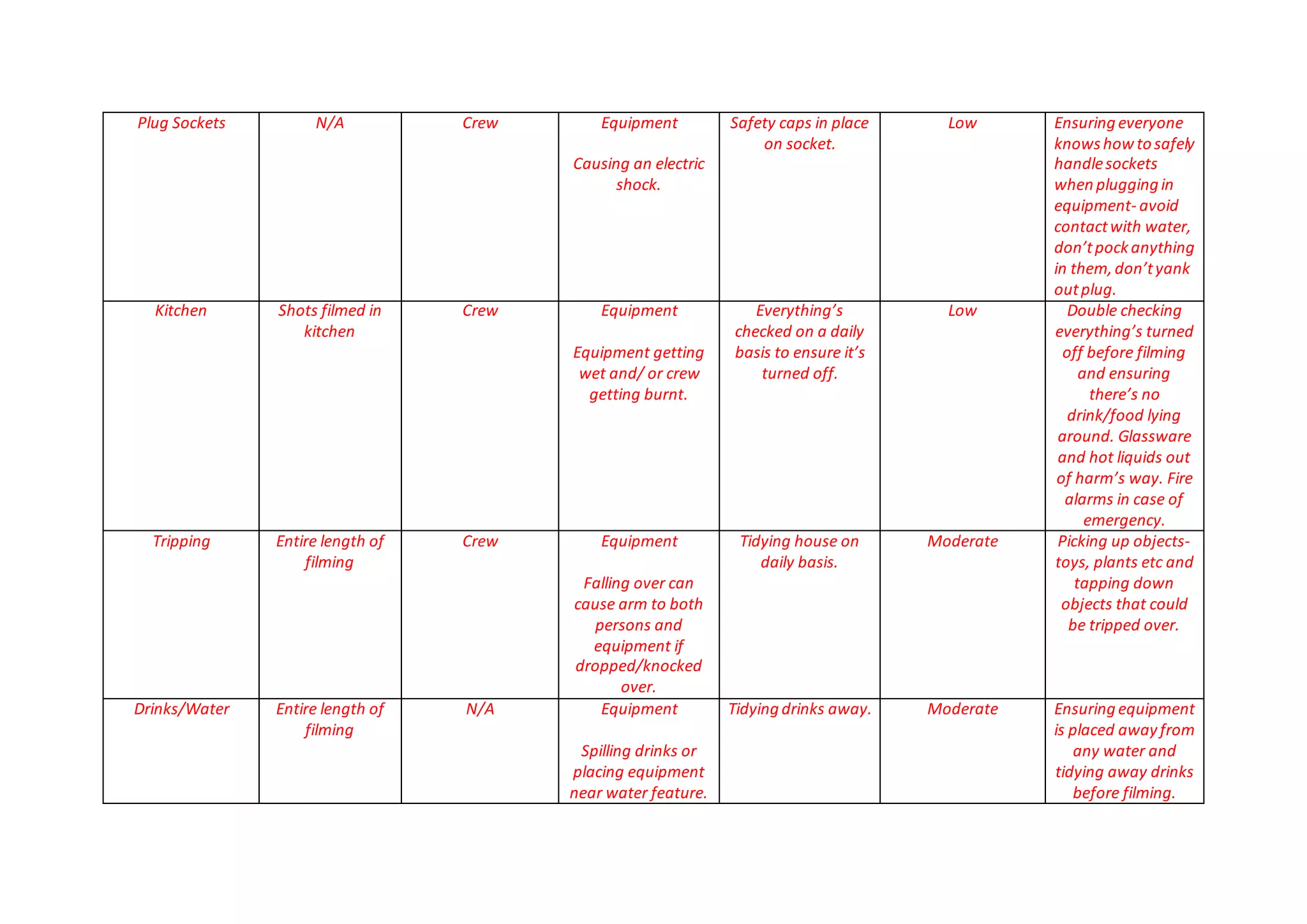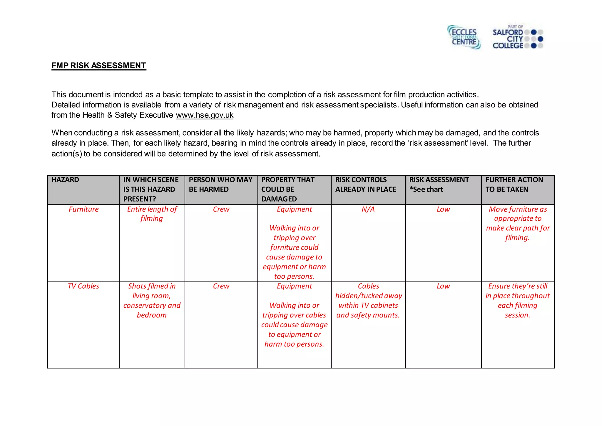 This document provides a template for conducting a risk assessment for film production activities. It includes a chart to assess risk level based on likelihood and consequences of hazards. The template lists potential hazards to consider for different scenes and locations, who may be harmed, what property may be damaged, existing controls, and any further actions needed to reduce risk. Examples of identified hazards include tripping over furniture or cables, electric shocks, burns and spills in the kitchen, lifting heavy objects, and pets interfering with filming.