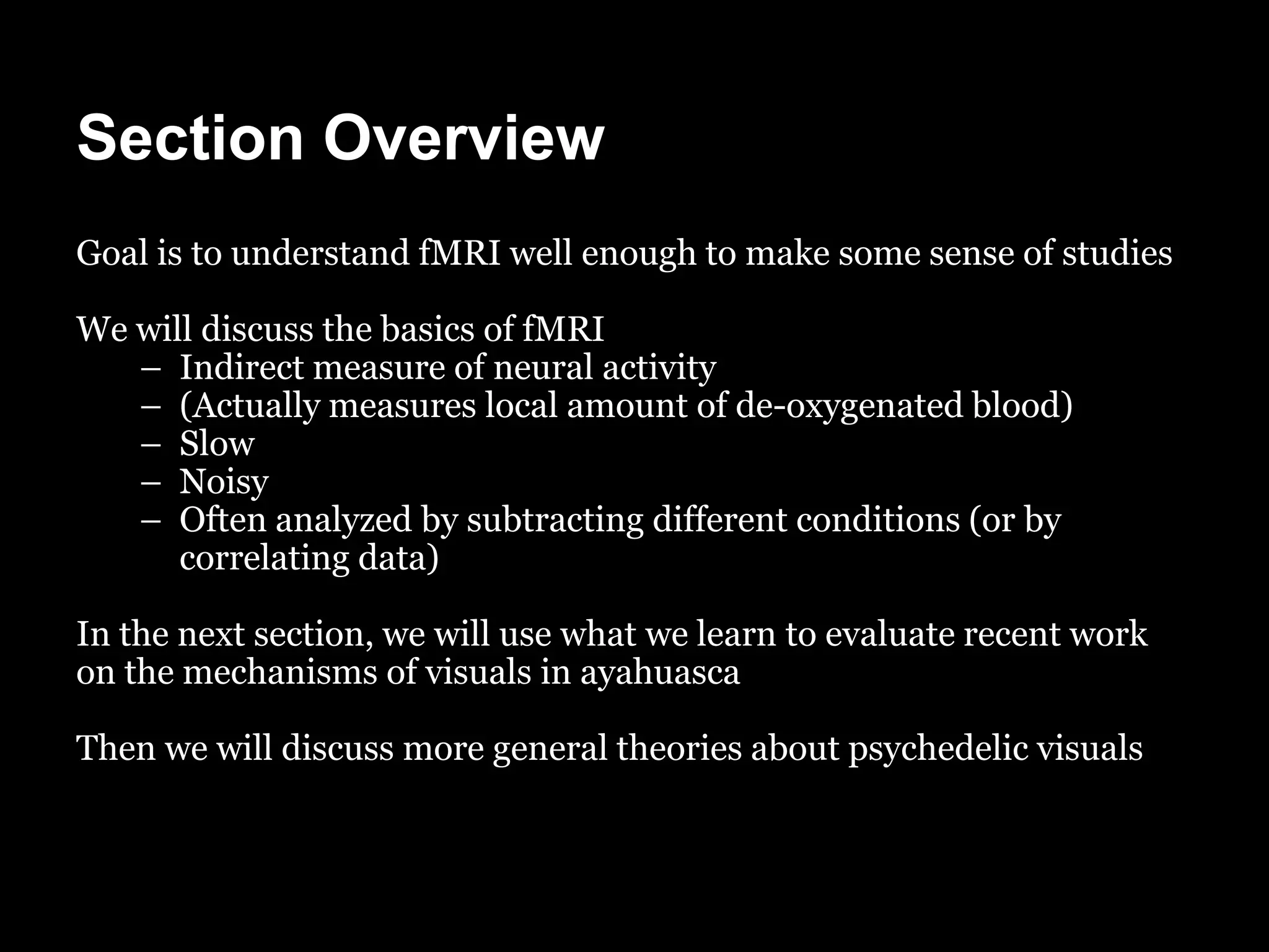 Functional magnetic resonance imaging (fMRI) indirectly measures brain activity by detecting changes in blood flow and oxygenation. It uses the difference in magnetic properties between oxygenated and deoxygenated hemoglobin, known as the blood oxygen level dependent (BOLD) signal. The BOLD signal is slow and noisy, peaks around 6 seconds after stimulation, and involves subtracting conditions to identify statistically significant activity changes. fMRI data is overlaid on high-resolution structural scans and analyzed using specialized maps of visual and other functional areas.
