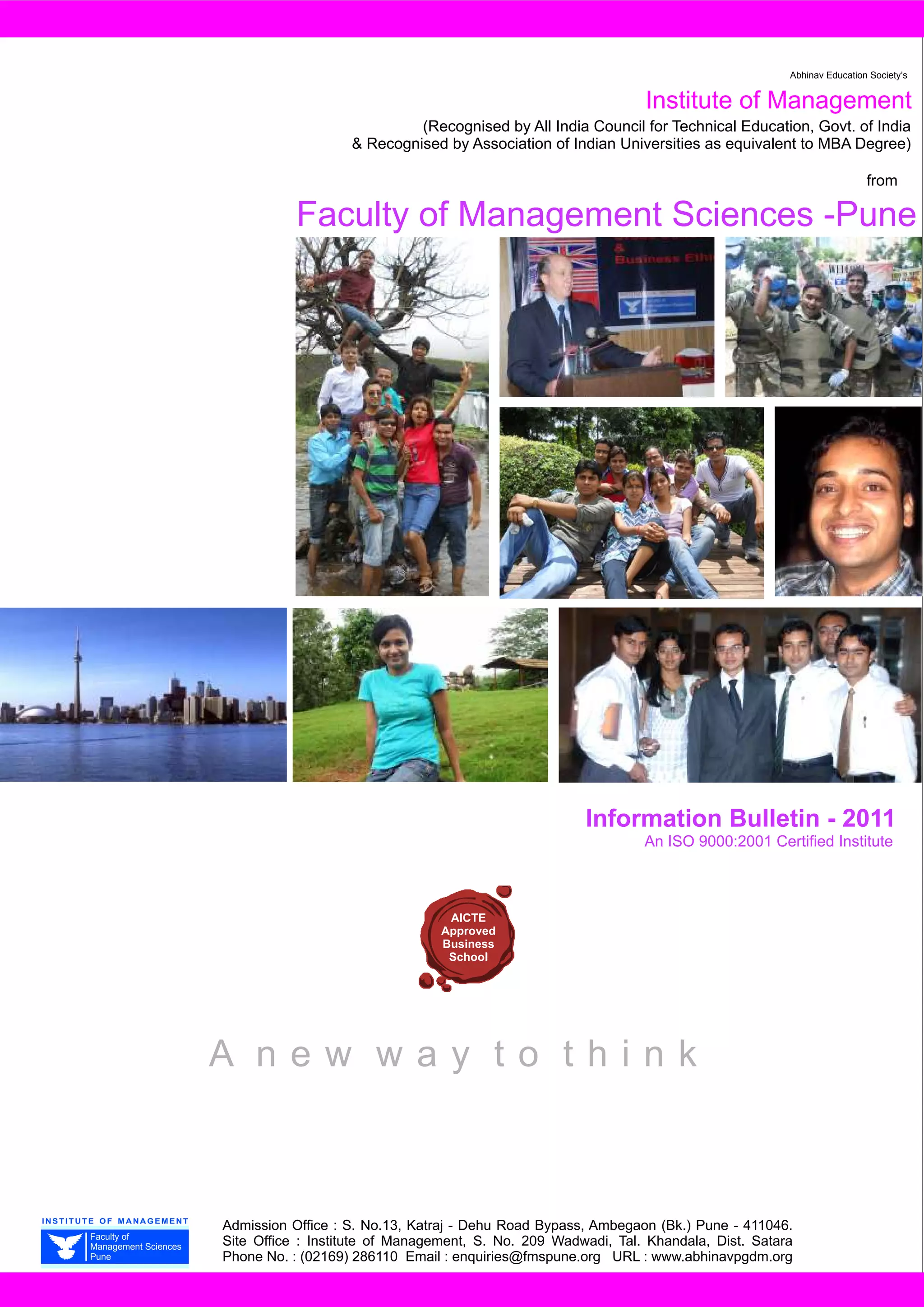 This document provides information about the Faculty of Management Sciences - Pune (FMS-Pune) including its vision, mission, leadership, programs, infrastructure, and academic approach. FMS-Pune offers a 2-year full-time AICTE approved PGDM program aimed at developing strategic leadership skills for successful careers. The program provides a solid foundation in core business functions along with opportunities for specialization, international exposure, skills development, and corporate internships. Students learn in a technologically advanced campus with facilities like libraries, classrooms, cafeteria, and hostels.