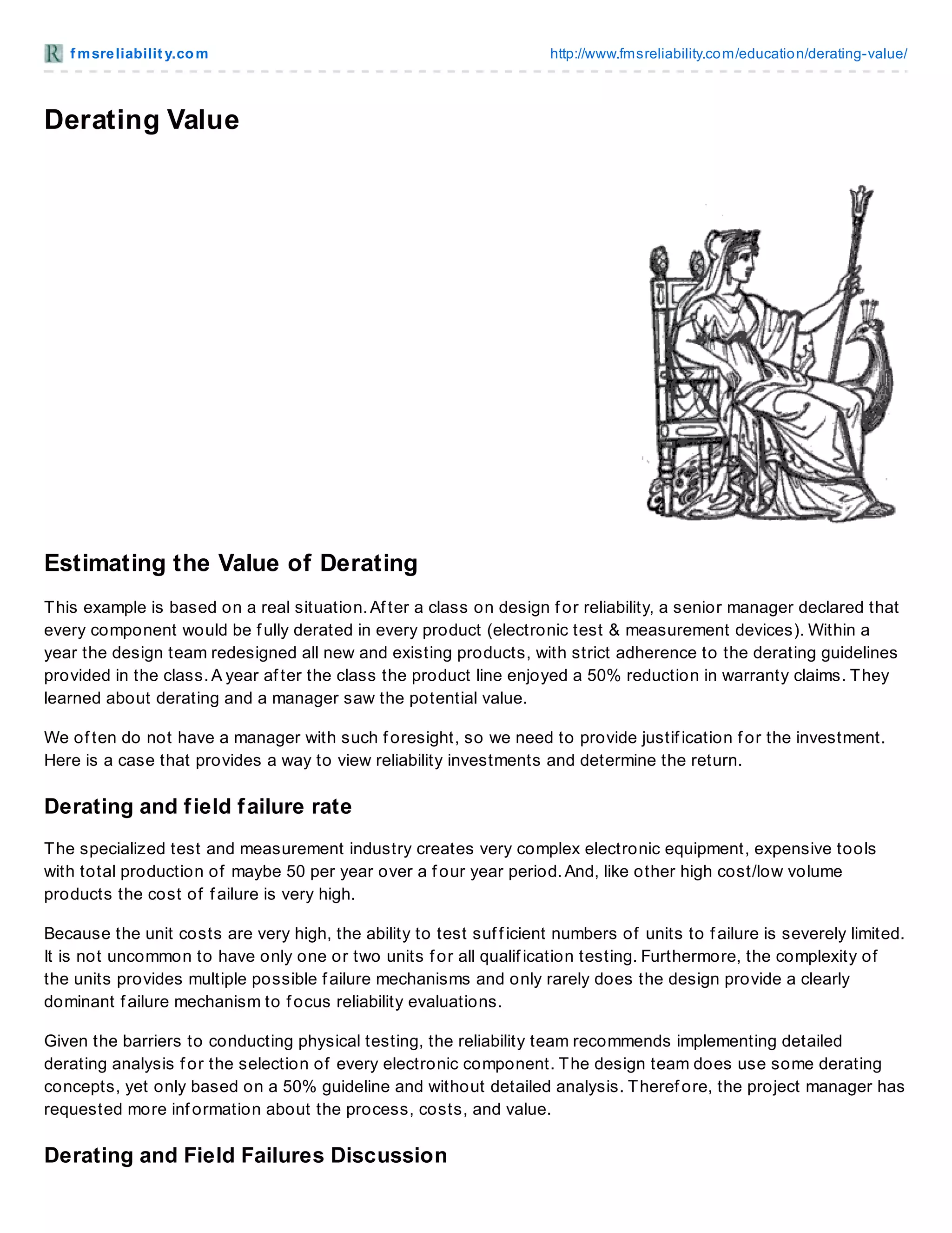 Derating involves selecting components that can withstand stresses beyond what is expected to improve reliability and reduce failures. A company implemented derating across all new products and saw a 50% reduction in warranty claims after one year. Derating components doubles the bill of materials costs but reduces field failure rates. For complex electronics with an average field failure cost of $2M each, reducing failures from 10% to 5% annually saves $5M per year. However, with a $6M cost to implement derating, the return on investment is less than 1 based on these estimates.