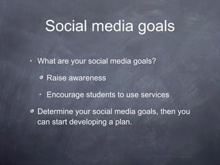 The document provides guidance on developing an effective social media strategy and presence. It discusses setting goals and determining the target audience. It also outlines best practices for different social media platforms like Facebook, Twitter, and YouTube. Key recommendations include engaging audiences with interesting content, being conversational, listening to audiences, and monitoring platforms for comments and engagement. Consistency across platforms and a casual but professional tone are also emphasized.