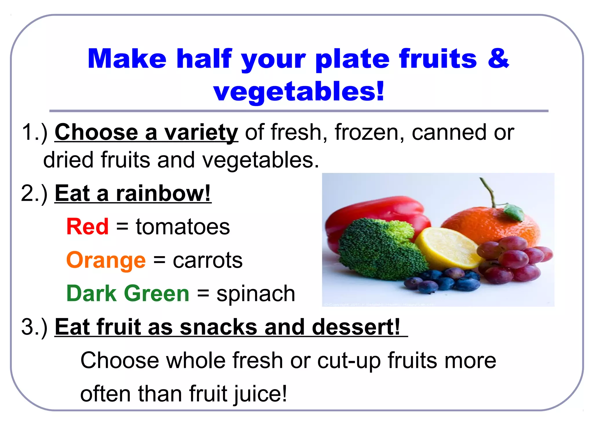 Choose My Plate and Dietary Guidelines provides recommendations for healthy eating and physical activity. It recommends making half your plate fruits and vegetables, switching to low-fat dairy, making at least half your grains whole, varying protein choices, and cutting back on foods high in solid fats, added sugars and salt. The guidelines also suggest eating the right amount of calories based on your needs and being physically active for at least 150 minutes per week. Key recommendations include balancing calories and nutrients, reducing sodium and refined grains, and increasing vegetables, fruits, whole grains and seafood.