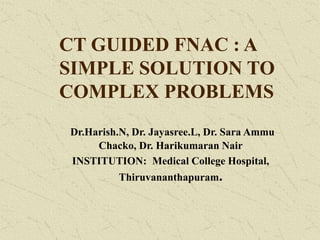 CT guided FNAC is a simple and effective technique for diagnosing complex pulmonary lesions. In a study of 28 patients, CT guided FNAC had a sensitivity of 80% and specificity of 100% for diagnosing malignancy. CT scanning alone had sensitivity of 75% and specificity of 83.3% for malignancy. Complications occurred in 3 patients (12.5%) and were minor and resolved with conservative treatment. The study concluded that CT guided FNAC is a highly sensitive and specific technique for characterizing pulmonary lesions.