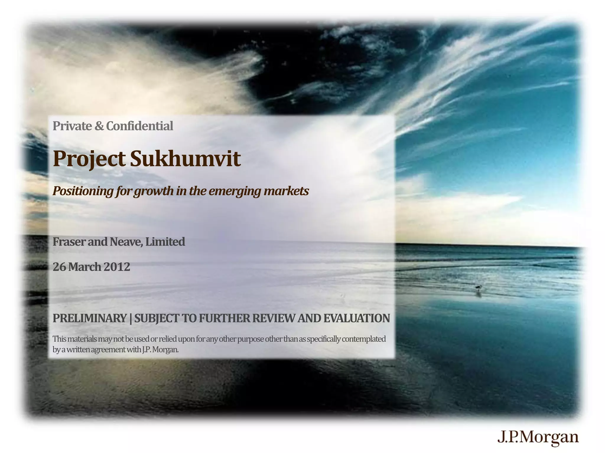 The document outlines a proposal by J.P. Morgan for Fraser and Neave Limited's potential acquisition of Malee Sampran Public Company Limited, termed the 'Sukhumvit deal', aimed at enhancing F&N's position in the Asia Pacific soft drinks market. It highlights the need for strategic advice, the importance of valuation, and focuses on addressing challenges such as market saturation and evolving consumer trends. The analysis reveals opportunities for F&N to grow regionally by expanding its product portfolio and distribution networks, particularly in the Indochina market.
