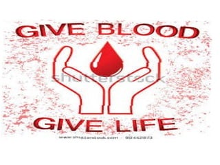 Blood is a red fluid that circulates through our bodies in veins and arteries. It acts as the body's transport system and helps fight infections. Blood cannot be manufactured and must come from donors to help patients in need. Donating blood is important to maintain a safe and reliable blood supply. There are eligibility requirements donors must meet including being in good health and avoiding fatty foods before donating. After donating, donors should drink fluids, avoid strenuous activity, and apply pressure if bleeding occurs at the needle site.