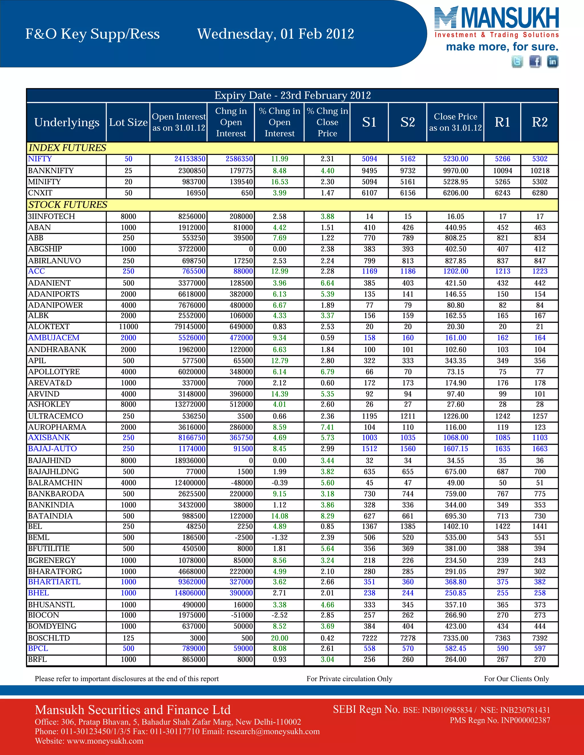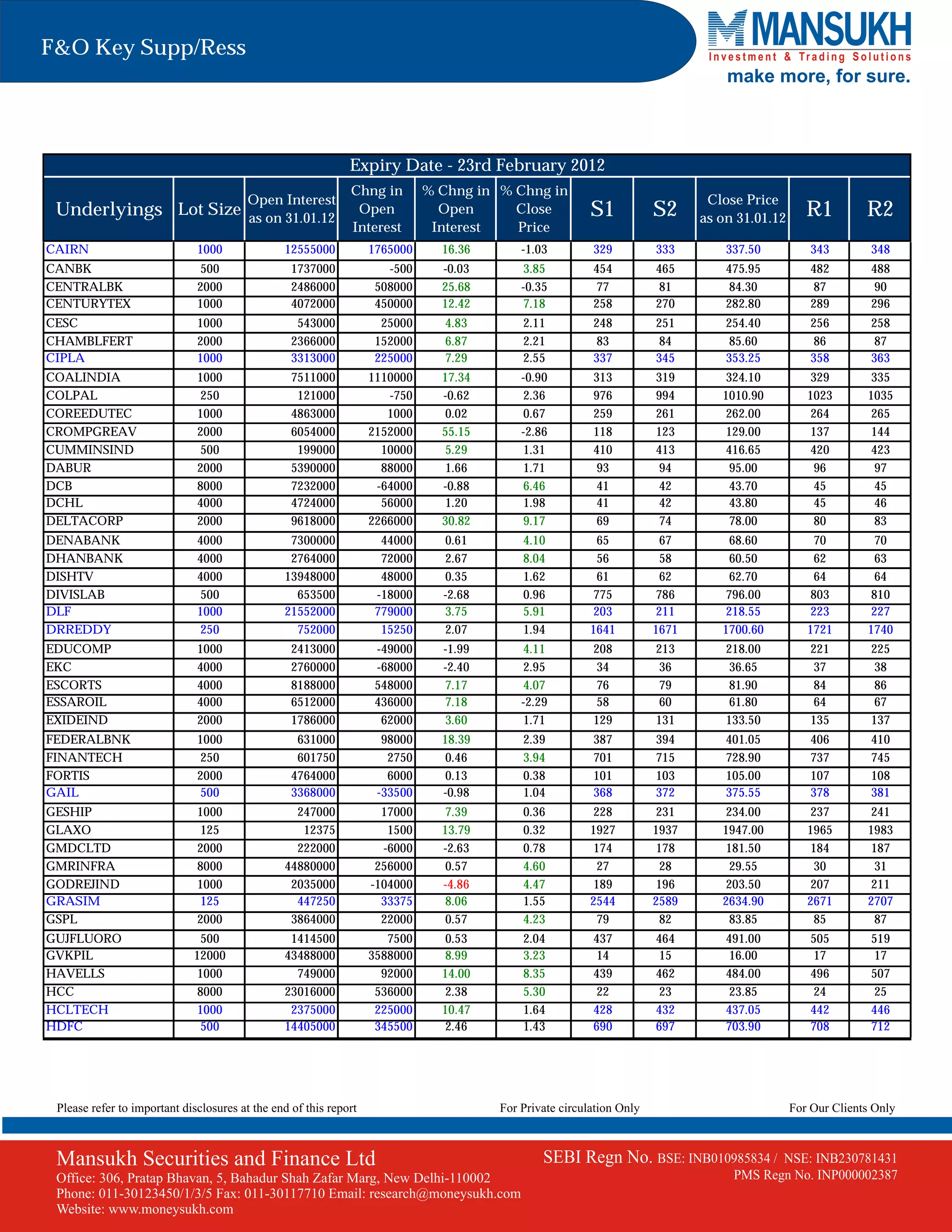 1. The document provides stock and index futures data as of January 31, 2012 including open interest, changes in open interest, support and resistance levels, and closing prices.