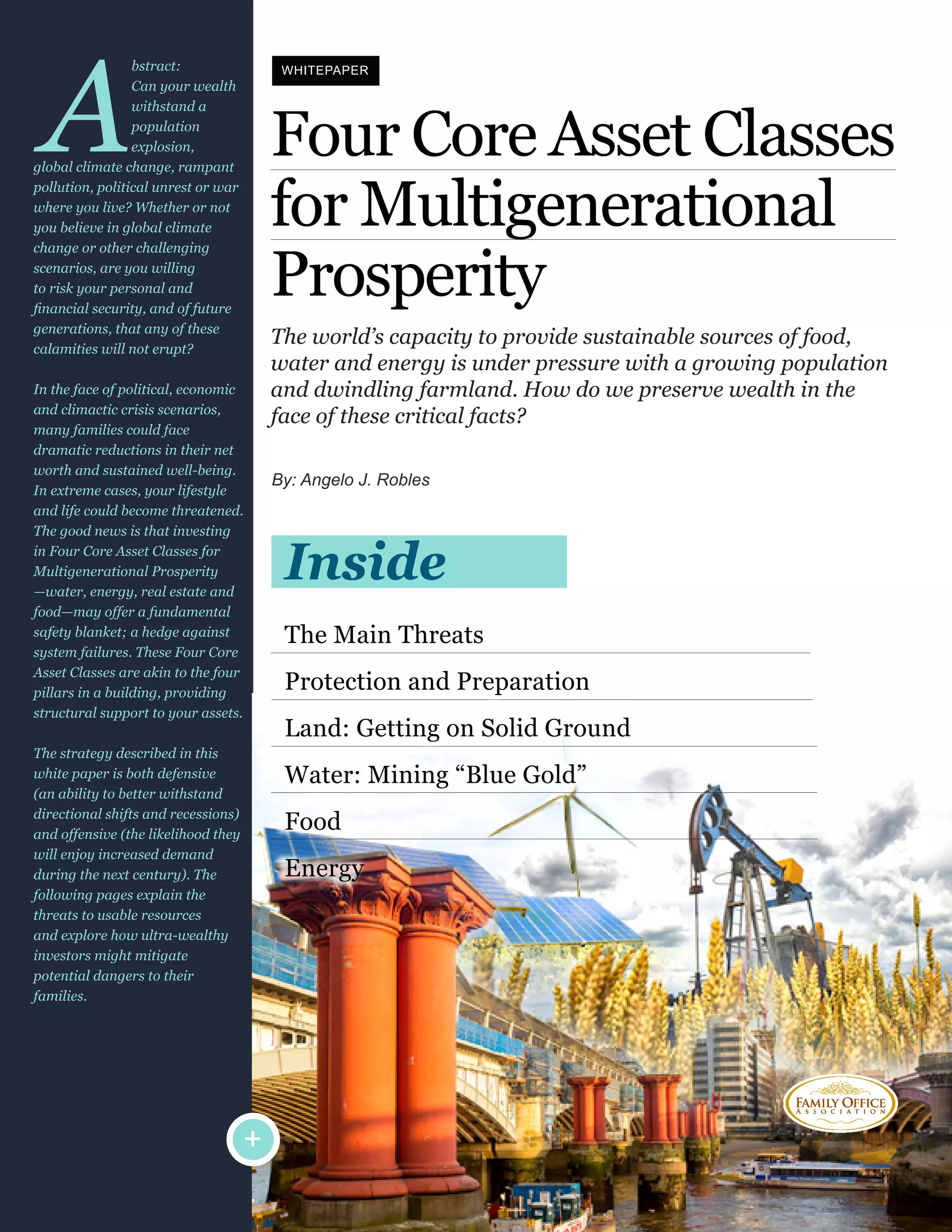 The document discusses four core asset classes - land, water, food, and energy - that can help preserve wealth in the face of threats from population growth, climate change, and resource scarcity. It recommends a two-pronged approach: 1) investing directly or indirectly in companies related to these assets, and 2) using personal wealth to purchase enough of these core resources so that families can become self-sustained. Specifically, owning fertile land provides opportunities to access water, produce food, and generate energy on-site. Wealthy families can purchase remote land with these resources to serve as a safe haven.