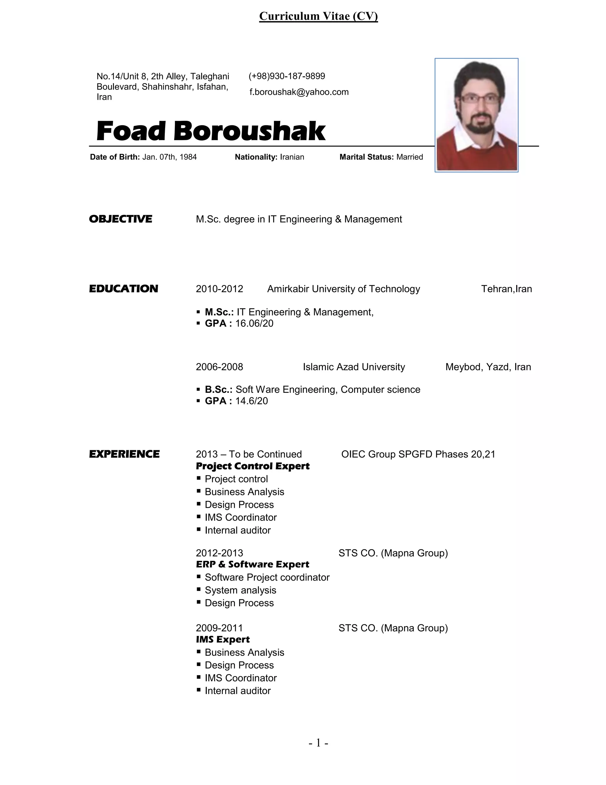 This curriculum vitae outlines the objective, education, experience, certificates, skills, and languages of Foad Boroushak. It shows that he received an M.Sc. in IT Engineering & Management in 2012 and a B.Sc. in Software Engineering in 2008. His experience includes roles in project control, business analysis, design processes, IMS coordination, and auditing for various companies from 2009 to the present. He also lists certificates in quality management systems and project control.