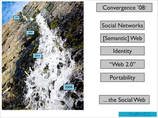 This document discusses the convergence of social networks and semantic web technologies like FOAF, OpenID, and OAuth. It provides a brief history of semantic web projects and social networking sites. It then explains how standards like FOAF, OpenID, and OAuth allow for decentralized social applications and a unified social graph by describing identities, connections between people, and permissions for sharing data across sites. The document suggests the emerging social web will focus more on groups than individuals and leverage evidence-based friend lists identified by OpenID and described by FOAF across multiple sites using OAuth.