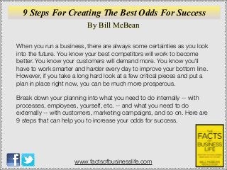 Bill McBean, author of The Facts of Business Life: What Every Successful Business Owner Knows that You Don't, shares 9 steps that can help you to increase your odds for success. All business owners face the usual headaches and worries that come with the day-to-day business of "running a business". However, if you take a long hard look at a few critical pieces and put a plan in place right now, you can be much more prosperous .