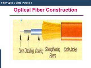 This document discusses fiber optic cables and their components. It begins by classifying optical fibers into single-mode fibers, which carry light along a single path, and multi-mode fibers, which carry multiple light paths. It then describes the core, cladding and coating layers that make up an optical fiber. Total internal reflection is discussed as the mechanism that keeps light confined in the fiber. Common fiber optic components like connectors, couplers and circulators are also outlined.