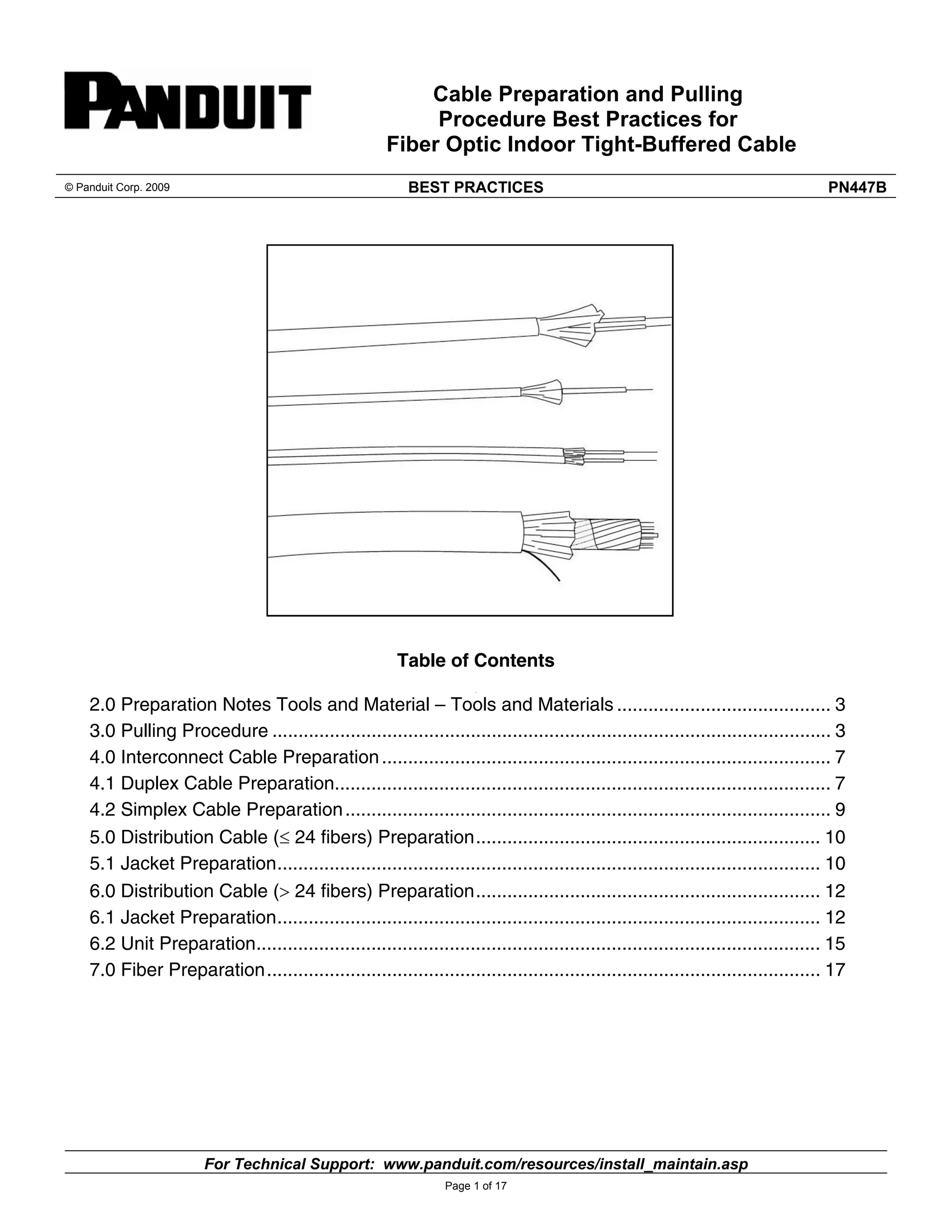 This document provides guidelines for preparing and pulling fiber optic indoor tight-buffered cable. It describes the necessary tools, safety precautions, and step-by-step procedures for selecting and installing pulling grips, removing the cable jacket, and preparing the cable core and fibers for termination. The procedures apply to tight-buffered, unitized, and breakout cable configurations with up to 24 or more fibers. Proper grip selection, sheath removal length, and friction tape application are emphasized to optimize cable pulling performance while avoiding damage.