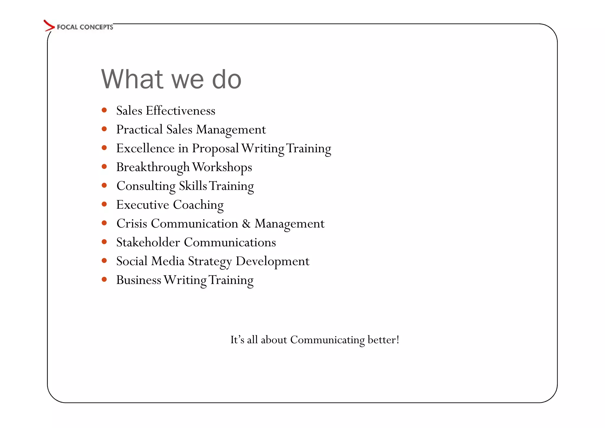 This document provides an overview of business consulting services offered by Focal Concepts, including sales effectiveness training, sales management, proposal writing, workshops, consulting skills training, executive coaching, crisis communication, stakeholder communications, social media strategy, and business writing training. It describes the approach and benefits for each service area. For example, it explains that their breakthrough workshops aim to accelerate collaborations through diverse stakeholder involvement, iterative solution design, and ensuring commitment to solutions. The document also includes case studies and outlines for training curriculums.