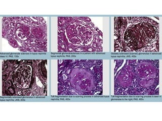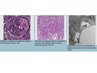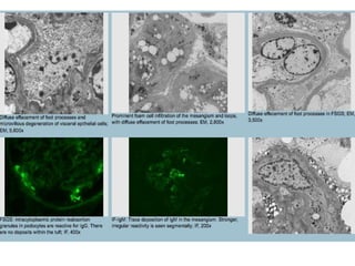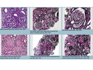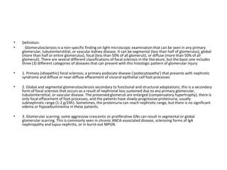 Focal segmental glomerulosclerosis (FSGS) is a pattern of kidney injury with segmental scarring of glomeruli. There are primary and secondary causes, with primary FSGS characterized by diffuse foot process effacement and nephrotic syndrome. Histologically, FSGS shows segmental glomerular scarring involving some but not all glomeruli, with foot process effacement on electron microscopy. Variants include collapsing, tip, and cellular variants seen on light microscopy. Secondary FSGS occurs due to adaptations from primary glomerular disease and shows focal global scarring with compensatory hypertrophy.