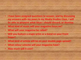The student was assigned questions to develop ideas for a music magazine for their media studies class. They conducted a focus group with their peers to get feedback on their initial ideas. For the magazine name, the focus group suggested "Loop" which the student decided to use. They also provided feedback on featuring a band on the cover, doing an artist interview for the double page spread, revising the color scheme to be less associated with metal/rock, and lowering the proposed subscription cost of £4 to £3 based on what would attract their target audience.