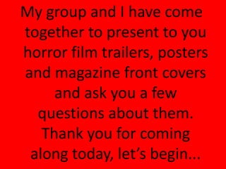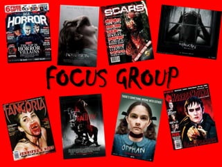 The document describes a focus group being conducted to get feedback on horror film trailers, posters, and magazine covers. Participants will view and discuss trailers for 5 horror films, analyze several film posters, and provide their opinions on horror magazine covers. For each media type, they will be asked questions about scariness, appeal, understanding of plot or genre from the visuals alone, and any changes they would make to improve the effectiveness of the marketing.