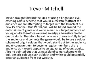 The focus group provided feedback on attracting a target audience of young adults to a new TV channel. Trevor suggested using bright colors in the visual style to appeal to young viewers. Anthony emphasized ensuring the visual style, including images, colors, fonts and typography, clearly represents and attracts young adults. Craig noted the importance of diverse representation of gender, ethnicity and culture in both programming and promotional materials. Lisa proposed using social media like Facebook and Twitter to promote the channel. Rachel pointed out the need for a broad range of content to appeal to different interests within the target demographic. [/SUMMARY]