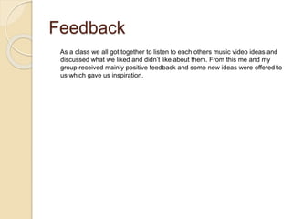 The document summarizes feedback from a focus group on music video ideas. Students shared their ideas and provided positive and constructive feedback to each other. For one group's monster-themed camp video idea, peers liked the mask concept and use of black costumes and sparklers, and offered suggestions like changing the camera speed during sparkler scenes and adding slow motion to the falling mask to create a feather effect. They also recommended ideas like monsters casting glitter spells and using confetti to depict a fun time.