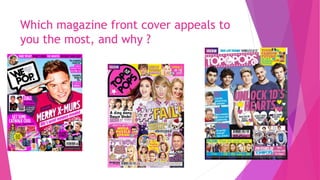 The document contains questions for a focus group about preferences for a pop music magazine, including questions about cover appeals, font attractiveness, double page spread preferences, desired content types and topics, front cover content, contents page appeals, preferred photo styles and sizes, desirable extras to include, pricing preferences, and preferred color schemes. The focus is on gathering reader opinions to help design an appealing magazine for fans of pop music and bands.